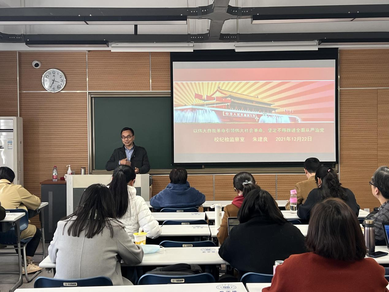朱建良指出,全面从严治党是一场伟大的自我革命,核心是加强党的领导,要把党的政治建设摆在首位,坚持以人民为中心,严抓作风建设。他着重梳理了党的十八大以来我国在加强党风廉政建设、完善国家监督体系、开展反腐败斗争工作中的重要举措,辅以大量的违法实例展现了全面从严治党和反腐败斗争中取得的治理成效,逐步形成了不敢腐、不能腐、不想腐的制度机制。同时,他又结合我省教育系统全面从严治党的情况,强调高校教师要严禁“红七条”行为、恪守“新时代教师职业行为十项准则”,杜绝不正之风和违法乱纪行为,牢记立德树人使命,努力为清廉公司、清廉公司建设添砖加瓦。