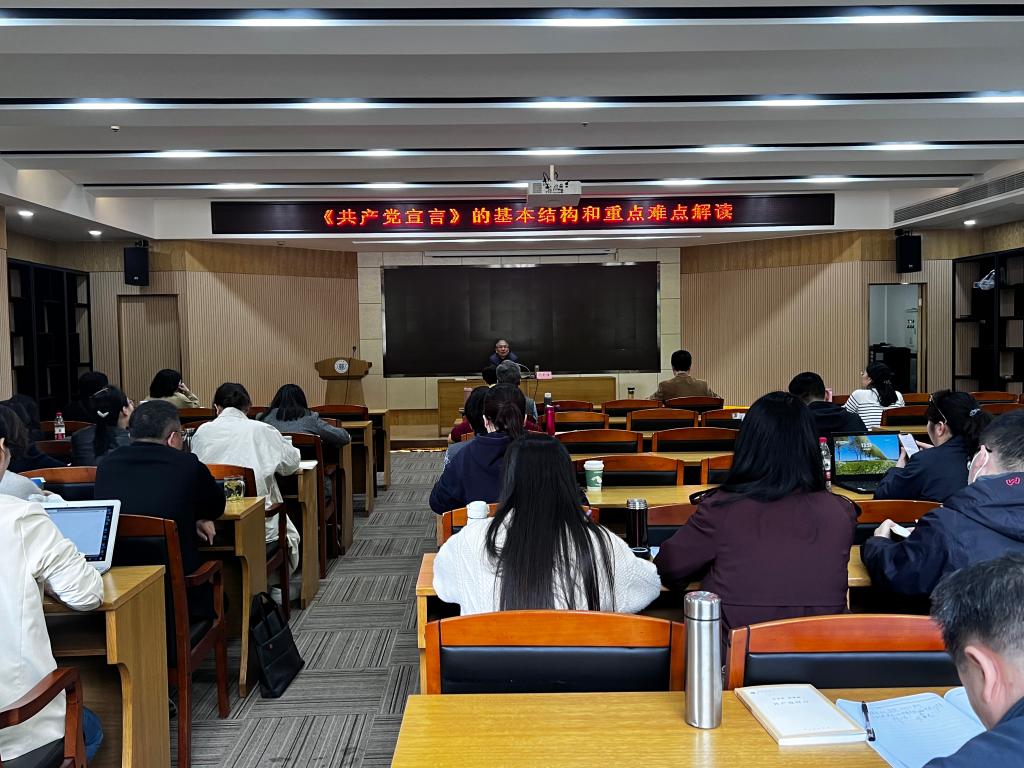 胡承槐教授向大家深入浅出地讲授了四方面内容:一是我们今天应如何看待《共产党宣言》,二是《共产党宣言》的写作目的,三是《共产党宣言》的基本框架和逻辑结构,四是《共产党宣言》的重点和难点解析。杨华经理作总结发言,她对马院教师提出三点要求:一是要读原著、学原文、悟原理,不断夯实自身的马克思主义理论基础;二是要从社会实践和时代特征出发,带着问题学、联系实际学;三是要以主题教育为契机,设定好自己的读书目标。