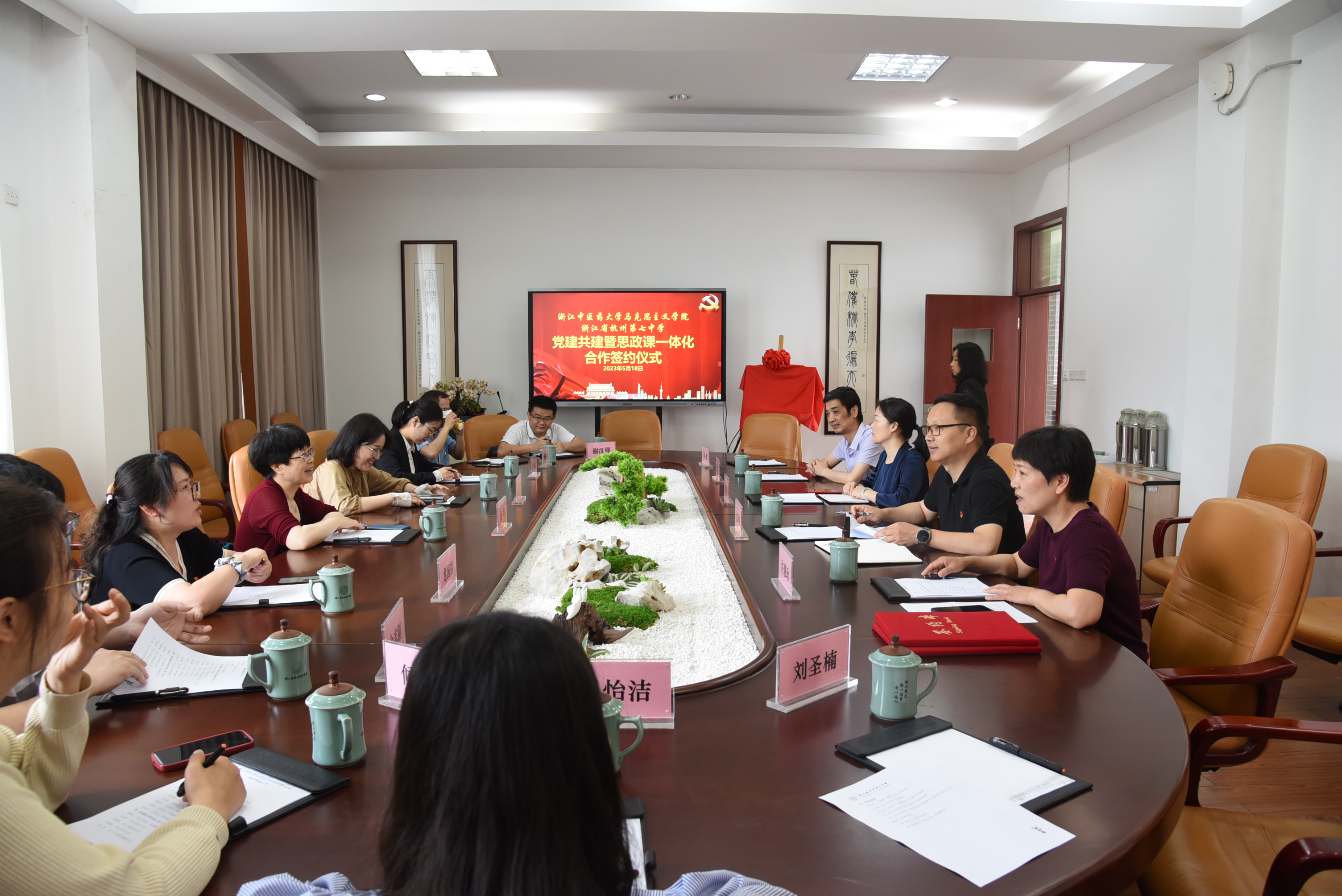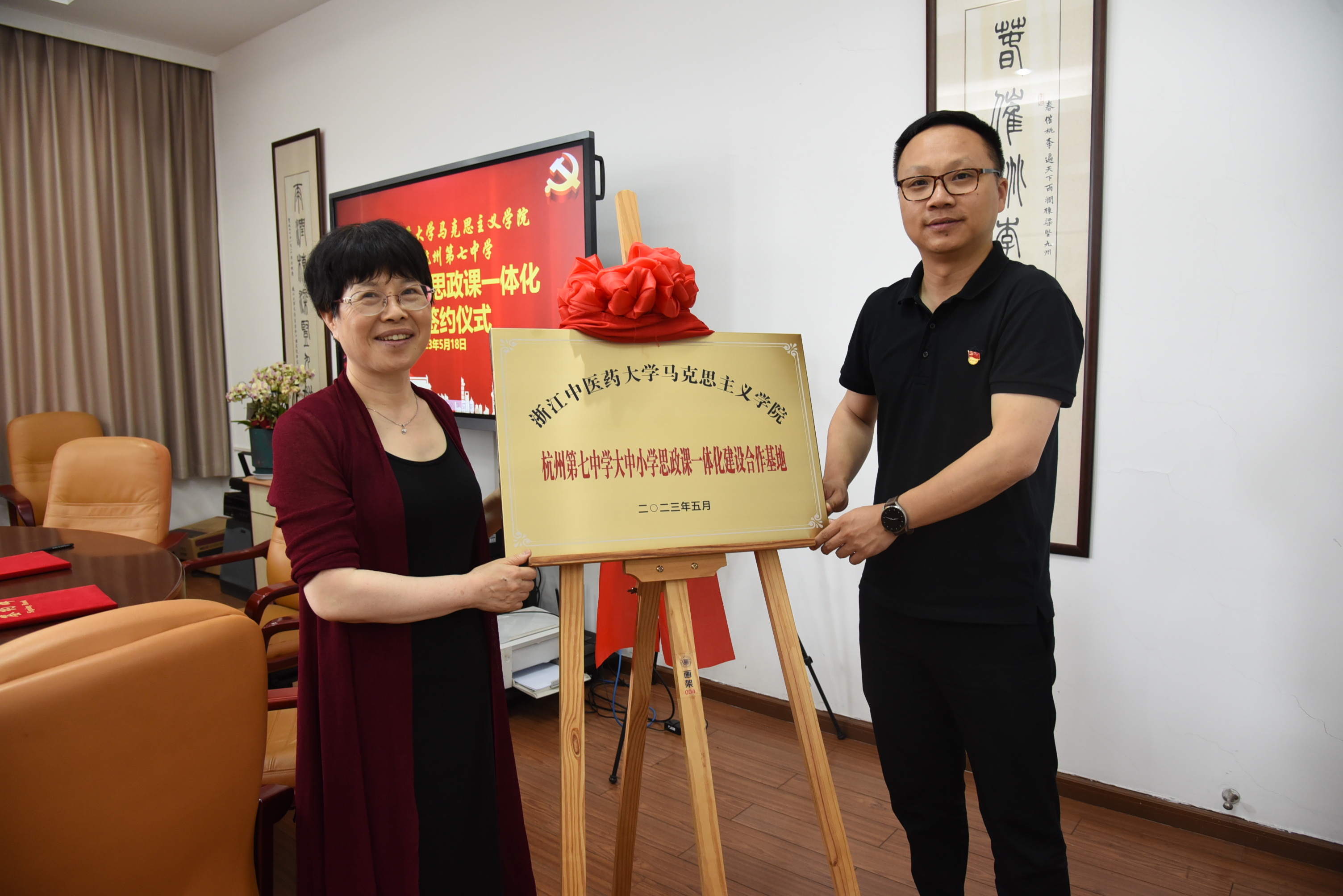 之后,杨华经理与夏峰平董事长签署了《大中小学思政课一体化共建合作协议》。签约仪式后,马院教师代表一行参观了杭州第七中公司史馆和党建阵地。
