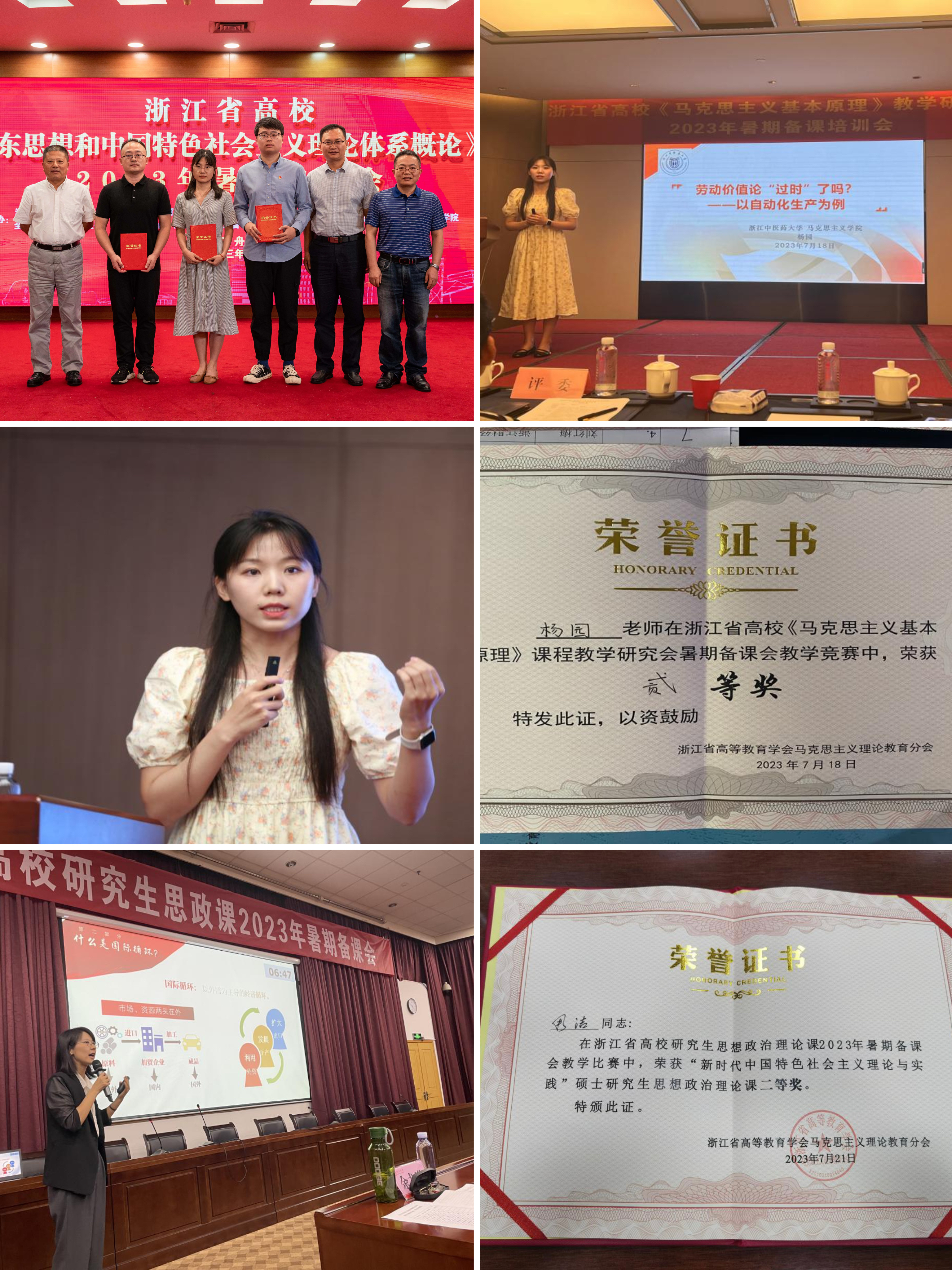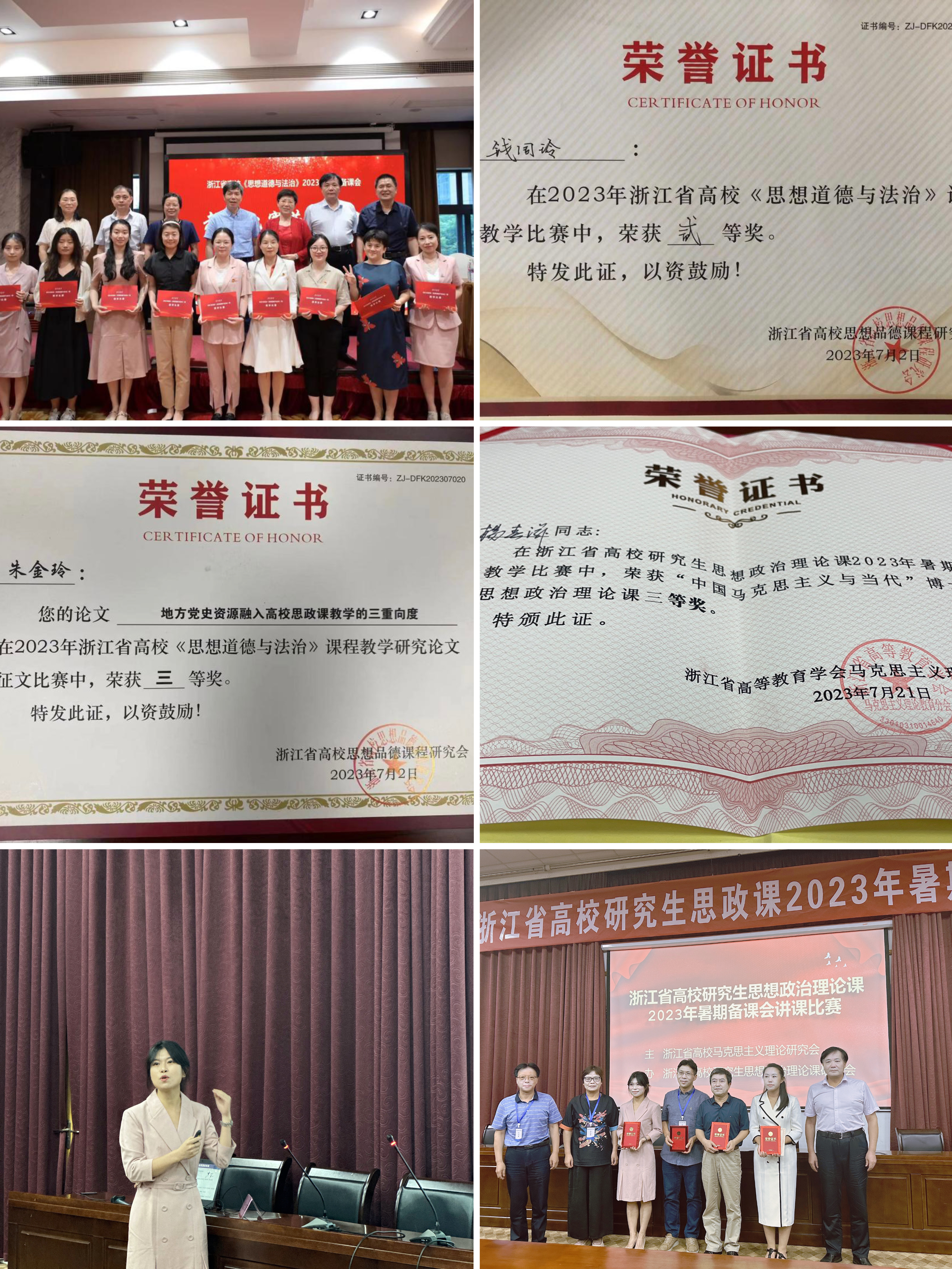 近日,2023年浙江省高校思政课暑期备课会教学比赛落下帷幕。公司教师积极参与并取得不俗成绩,在“教强马院”建设上彰显新成效。宋增元老师荣获《毛泽东思想和中国特色社会主义理论体系概论》课程讲课比赛一等奖;钱国玲老师荣获《思想道德与法治》课程讲课比赛二等奖;杨园老师荣获《马克思主义基本原理》课程讲课比赛二等奖;周洁老师荣获《新时代中国特色社会主义理论与实践》硕士研究生思政课讲课比赛二等奖;杨春滋老师荣获《中国马克思主义与当代》博士研究生课程讲课比赛三等奖。此外,朱金玲老师荣获浙江省高校《思想道德与法治》课程教学研究论文征文三等奖。