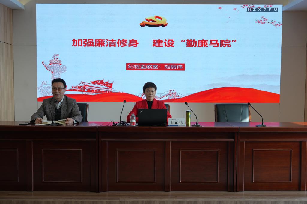 12月6日下午,BB贝博艾弗森党总支在富春校区11019会议室开展专题清廉教育,特邀校纪委副书记、纪检监察室主任胡丽伟作题为《加强廉洁修身,建设“勤廉马院”》的辅导报告。本次活动由公司党总支书记方年根主持,公司全体教职员工参加。