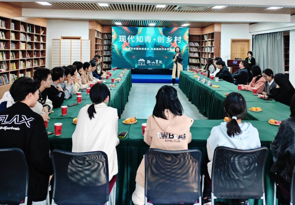 在径山书院,师生与其创始人陈洁瑾老师开启了热烈生动地交流。陈老师以“现代知青·创乡村”的书院文化为切入,全面介绍了径山书院的发展背景、运行理念、项目特色等情况,让我们感受到书院的年轻活力,是一个集“礼乐射御书数”六艺及数字团建、农业培训、研学旅游、农产品销售为一体的、传统与现代完美融合的文农旅商科综合体,蕴含着丰韵深厚的径山文化,以及一脉相承的知青精神,是杭州后花园内最具腔调的书院和联农带农共同富裕的典范。