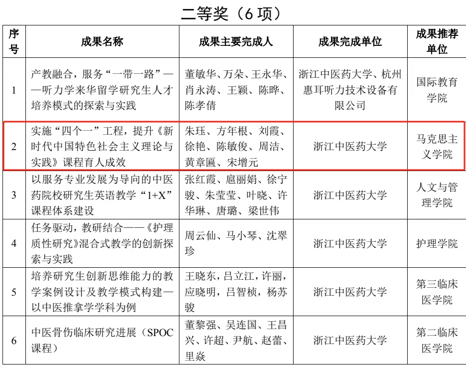 近年来,该团队在朱珏教授带领下,以浙江省首批高校思政课名师工作室(朱珏)为依托,积极进行教学改革研究与实践,成功申报了多项教学改革项目,取得了不俗的成绩。2018年、2022年,朱珏教授团队两次获校研究生优质课程建设项目立项。2023年,朱珏教授团队获浙江省优秀研究生课程建设项目立项,同年,该研究生“中特理论”课程获浙江省课程思政示范课程立项。2024年初,朱珏教授团队获浙江省高等学历继续教育精品在线开放课程项目立项,目前团队正积极准备线上课程建设的前期工作,该课程预计于2024年9月上线浙江省教育厅继续教育线上学习相关平台。