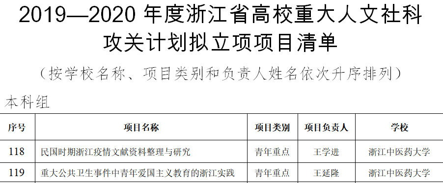 今日,浙江省教育厅公布了2019—2020年度浙江省高校重大人文社科项目攻关计划项目遴选结果,BB贝博艾弗森有2个项目喜获立项。获批的2个项目分别是王学进申报的《民国时期浙江疫情文献资料整理与研究》和王延隆申报的《重大公共卫生事件中青年爱国主义教育的浙江实践》。