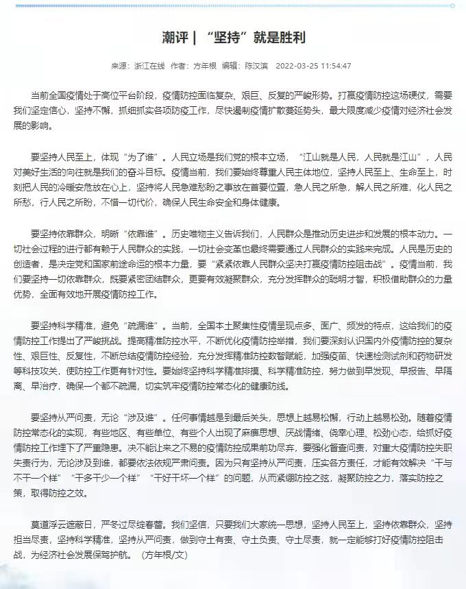 日前,公司党委组织部印发了《关于充分发挥各级党组织作用为疫情防控、助力亚运提供坚强保证的通知》。今天,BB贝博艾弗森党总支书记方年根教授在浙江省委省政府新闻门户网站《浙江在线》发表评论文章《“坚持”就是胜利》,为做好新形势下疫情防控工作提供积极舆论支持。