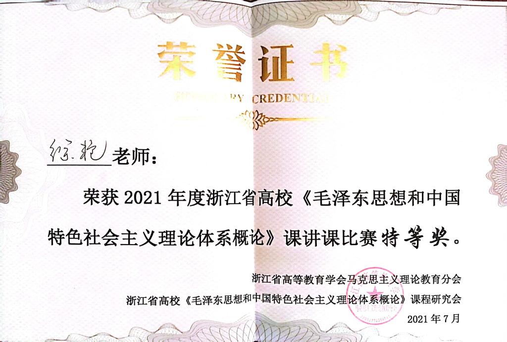 公司徐艳老师荣获 2021年度浙江省高校《毛泽东思想和中国特色社会主义理论体系概论》课讲课比赛特等奖