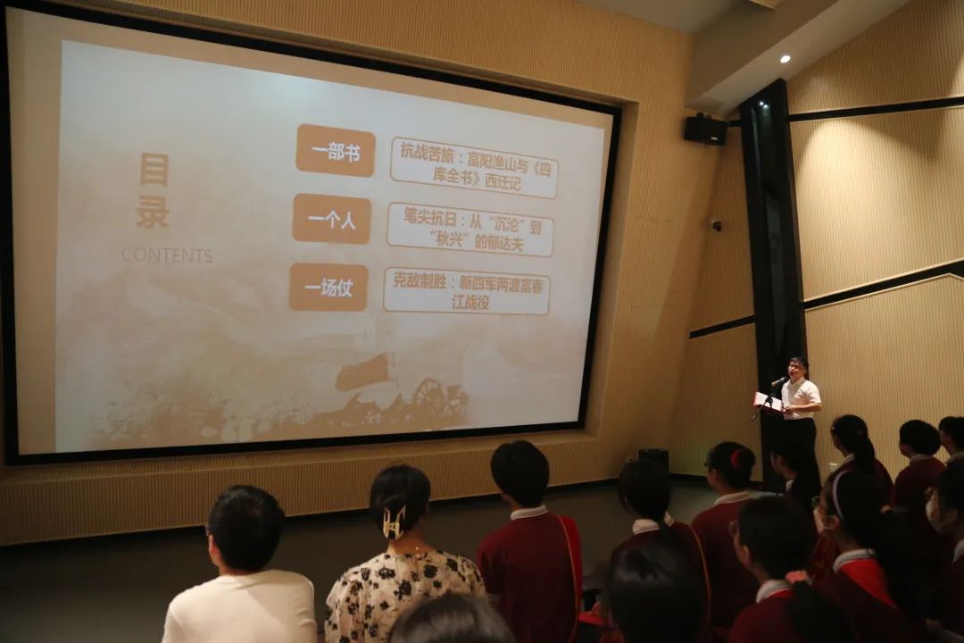 签约仪式结束后,公司中国近现代史纲要教研室谢汉卿博士为银湖中学的员工代表们进行了一场题为《富阳记忆:讲述浙里的抗战故事》的红色主题讲座。从“一部书”——富阳渔山与《四库全书》西迁记,“一个人”——从“沉沦”到“秋兴”的郁达夫,以及“一场仗”——新四军两渡富春江战役三个角度,谢老师带领现场师生回溯浙地抗战的峥嵘岁月,重拾发生在富春江两岸的不灭记忆。